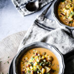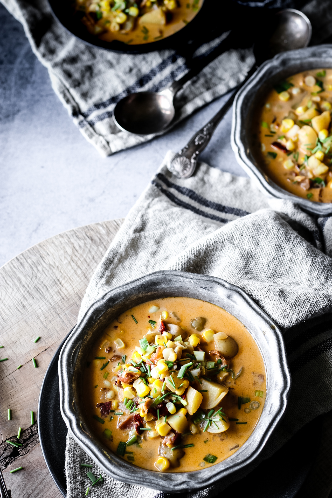 There’s really not much to Chipotle Corn & Bacon Chowder as far as ingredients goes: bacon, onion, garlic, little potatoes, chipotle peppers in adobo sauce, cream. It has the most wonderfully smoky, sweet flavor & creamy texture that became my favorite soup when I first made it several years ago. For that reason I had to share it on my brand new website. It is a recipe I come back to when the leaves on the trees start to change & the mornings become brisk. The smoky chipotle peppers in the adobo sauce are really where a lot of the flavor comes from. I also use good, homemade broth. When corn isn’t in season frozen or canned corn works great. This is one of my favorite soups: it’s simple to make and has such a wonderful taste – sweet and smoky. I hope it becomes one of your favorites too.